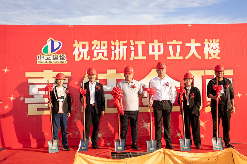 公司董事長周國強、副董事長周健、總經理鐘鳴、副總經理池甘萍、副總經理葉麗紅等人共同拿起鐵鍬,為中立大樓澆筑結頂,迎來了歷史性的時刻。